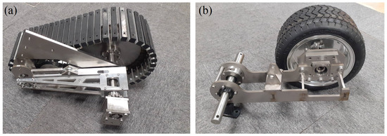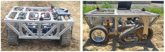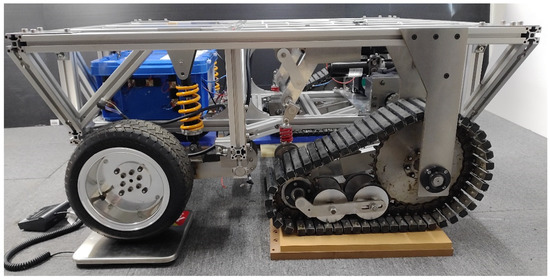 The total weight of the vehicle without any payload is 237.5 kg. The weight distribution has been measured using a weight scale, as in Figure 14, and those measurements have been used to locate the center of gravity. In wheel mode, the weight measured is 65.5 kg and 69 kg for the left and the right tracks, respectively, and 52.5 kg and 50.5 kg for the left and right wheels, respectively. Although the track mode’s weight distribution is measured similarly, the result depends on the EHA final extension and the characteristics of the shock absorber, as detailed in our previous work [23]. With a maximum extension of the EHA (100 mm), the vertical load on the wheels becomes 31.5 kg and 33.5 kg for the left and right wheels, respectively. Future works will investigate the effects of different EHA extensions and weight distributions in a real environment. The main characteristics of the vehicle are summarized in Table 2.