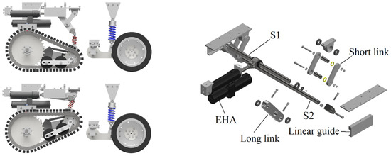 The last group to be described is the switching mechanism. This is a Scott Russel linkage, which converts the horizontal displacement of an electro-hydraulic actuator (EHA) into a vertical linear movement of the idlers. The mechanism consists of an EHA connected to a shaft (S1) with two bearings mounted at its ends. The bearings are inserted into two parallel linear guides. The shaft is coupled with the longest link of a scissor mechanism where the long link length is double that of the short one. A revolute joint connects the middle of the long link to one end of the short link. The other end of the long link is coupled with a second shaft (S2) connected to the idlers’ shock absorbers, as shown in Figure 10. The EHA displacements cause S1 to move along the linear guide and close or open the scissor mechanism to lift or lower S2 and the shock absorbers connected to the track modules.