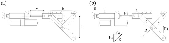 The relation between the horizontal displacement of the EHA and the vertical displacement of the idlers is evaluated as h = b(x) × tang(α), where b = bmax − x, and bmax is the maximum distance between the roller shaft and the revolute joint of the short scissor link, and α is the angle between scissor’s links and the horizontal, as in Figure 11a. We selected the desired vertical displacement of the idler to be in the range of 100–150 mm. With this displacement, we can ensure that, while in wheel mode, the shape in contact with the ground is circular, as if it were a wheel. Figure 11b provides the static analysis of the mechanism. The number 0 indicates the chassis, 1 is the actuator, 2 and 3 are the long and short scissor links, respectively, and 4 is the linear guide. Fa is the actuator force, R the reaction force on the link and Fs the force on the idler. As can be seen from the static analysis, small values of the angle α in track mode would require a high actuator force and a higher reaction force on the links. In wheel mode instead, the actuator only lifts the idler, and relatively small α angles can be accepted. The mechanism synthesis is a trade-off between the space available inside the chassis, the desired vertical displacement, and the necessity to avoid small angles. In the final design, the α angle in track mode is 53 degrees.