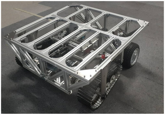 The track system module was designed and realized from scratch using a steel chain with mounted attachments. A U-shaped aluminum channel and a rubber lug are fixed on each attachment by bolts and glue. The chain is connected to two gears, a sprocket, and an idler. The sprocket has a larger diameter than the idler to facilitate the wheel mode configuration when the idler is lifted. A more detailed description of the track module design can be found in [18,23].