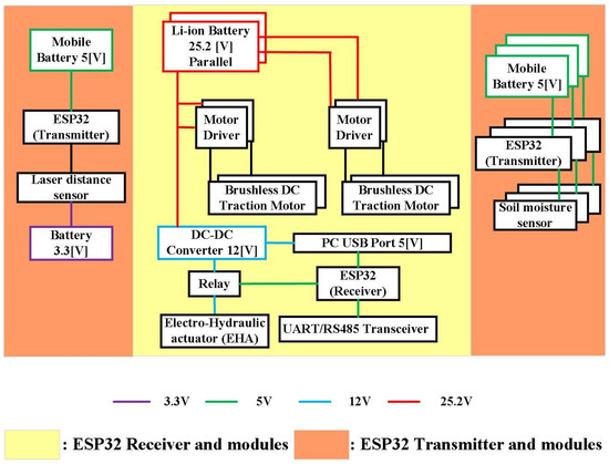 In Figure 15, the flowchart of Hadrian’s power system is provided. This includes two Li-ion batteries of 25.2 V for the four brushless DC motor driving tracks and wheels and a DC–DC converter from 25.2 V to 12 V for supplying energy to the electro-hydraulic actuator (EHA). The vehicle is equipped with a microcontroller ESP32, which has Wi-Fi integrated, used for receiving the soil moisture information from the field. The ESP32 microcontroller (receiver) is connected to a PC by USB. The relay and UART/RS485 transceiver is powered through an ESP32 (receiver) with 5 V. Each soil moisture sensor in the field (three in the example of Figure 13) is connected to a separate ESP32 (transmitter) in wireless communication with the ESP32 onboard the vehicle. Mobile batteries of 5 V power the moisture sensors. The final number of soil moisture sensors will depend on the size of the field and the expected soil moisture variability.