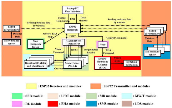 In Figure 16, the system components are grouped into modules depending on the function. The SEB is the stop emergency button, U/RT is the UART/RS485 transceiver, MD is the module consisting of the motor drivers, MW/T module is the mechanical connection among motors and running gears (wheels and tracks), RL is the relay, EHA module is the electro-hydraulic actuator connected to the switching mechanism, and the SMS module consists of the soil moisture sensors. Finally, the LDS is the laser distance sensor module.