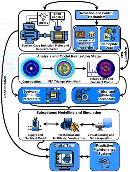 Curve fitting and machine learning algorithms that are optimized to give trustworthy estimations enable this system. The rest of this paper is structured as follows: Section 2 depicts the workflow of designing the digital twin as well as its mathematical backbone. Section 3 delineates the hardware and software aspects of the SCIM digital twin. Section 4 highlights the design of the predictive maintenance system, and in Section 5, there is a case study that describes how the model was applied and evaluated. Section 6 presents the outcomes of the PM system. The study is concluded in Section 7.