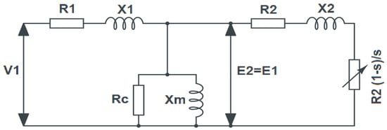 The core of the DT system is the SCIM, whose particulars were extracted by utilizing comprehensive hardware experimentation. The setup minimizes the use of expensive sensing and data acquisition mechanisms as the DT creation is equally supported by reconfigurable multiphysics modeling. In order to simulate a comprehensive co-simulated model, it is necessary to establish the mathematical relationships that govern the SCIM’s electrical behavior. This is most efficiently performed using an equivalent circuit model [23], as shown in Figure 2, where V1 is the terminal voltage of the stator winding in the per-phase, R1 is the resistance of the stator winding in per-phase, X1 is the leakage resistance, E1 is induced voltage in the stator winding, RC is the stator core loss resistance, Xm is the magnetizing reactance, and so is the slip. Similarly, R2 is the resistance of rotor winding in per-phase, X2 is the rotor leakage reactance in per-phase, and E2 is induced voltage in the rotor at a standstill, all as referred to the stator. In the balanced state, the input Power (Pin) is given as shown in Equation (1).