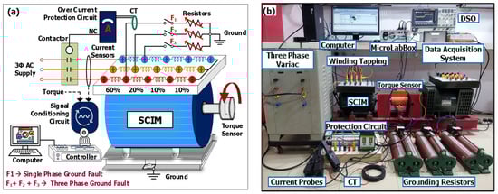 SCIM with single-phase and three-phase ground faults: (a) hardware schematic; (b) experimental arrangement.