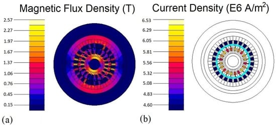 Steady-State Electromagnetic Contours: (a) magnetic flux density Iso-values chart; (b) current density Iso-values chart.