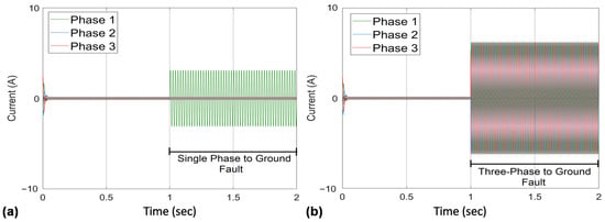 Fault model simulation results: (a) single phase to ground fault; (b) three phase to ground fault.