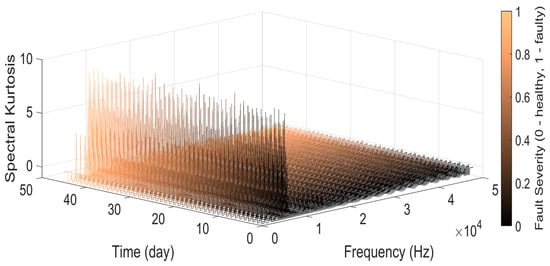 The first data feature obtained in this subsystem was the spectral kurtosis of the torque signal. This feature indicates in which frequency the transient or, in this case, the fault occurs for each day of the data collection. As a result, it can allow us to analyze distortion at a particular frequency, thus optimizing the analysis.