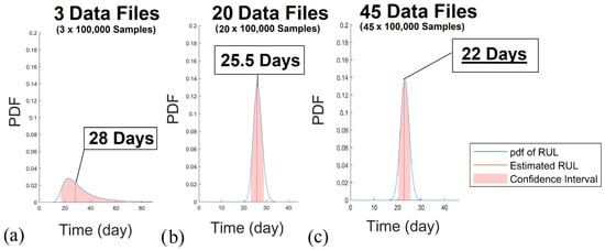RUL estimation results with increasing data samples: (a) with 3 data files; (b) with 20 data files; (c) with 45 data files.