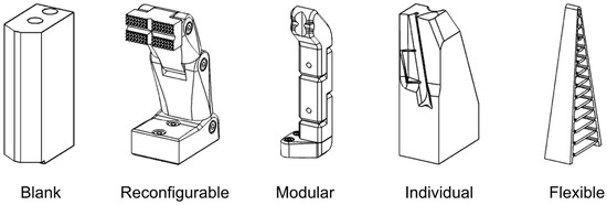 Figure 1 shows different types of gripper fingers. These range from finger blanks for manual reworking to highly flexible gripper fingers that can adapt to the geometry of the workpieces during the gripping process. The more inflexible a single finger is, the more the interchangeability of the finger or finger components serves to adapt the finger to a handling task; gripper finger blanks in the form of aluminum or steel cuboids have appropriate features for connection to the gripper, but must be reworked by the user for each task [6,7]. Reconfigurable gripper fingers can be manually adjusted by positioning pins [8,9] on a die plate or changing the joint angles of multi-link fingers [10]. Modular gripper finger approaches include gripper fingers composed of modules [11] and approaches in which entire fingers can be selected from a finger collection as modules of the gripper and attached to the gripper via a standardized interface [12].