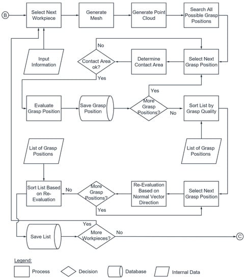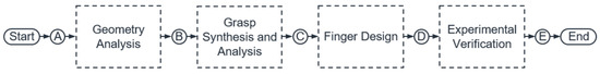 In the geometry analysis (A–B), the necessary information for the following processes of the grasp synthesis and finger design is determined. Every automated gripper finger design requires input information. This includes, for example, information about the workpiece or the gripper used. This is collected and analyzed in the first step. An important step in the development of gripper fingers is the grasp synthesis and analysis (B–C). In the context of robotics, a grasp is generally defined as the set of contacts on the object surface that prevent the potential motion of the object due to external disturbances [25]. The identification of these contacts is part of the grasp synthesis, while the evaluation of the determined grasps is part of the analysis. Finding grasps on objects can be performed based on data or analytically. While a large number of possible grasps can be found very quickly with the data-based approaches, the traceability of the grasps is not always comprehensible. Analytical approaches, on the other hand, allow the comprehensible finding of grasps, but can be very time-consuming, especially for complex handling objects. A variety of metrics, such as the Ball criterion according to [26], have been proposed by researchers to evaluate grasp quality. The step of finger design (C–D) can be very different. With regard to the types of gripper fingers described above, approaches exist for the automated design of reconfigurable [8,27], individual [5,28], and modular gripper fingers [29]. The approaches for reconfigurable fingers are limited to the arrangement of pins on a perforated plate. The design of individual gripper fingers is already commercially available [3] or is being investigated as a controllable approach in research [5,28]. In the area of modular fingers, a concept exists that has not yet been realized [29].