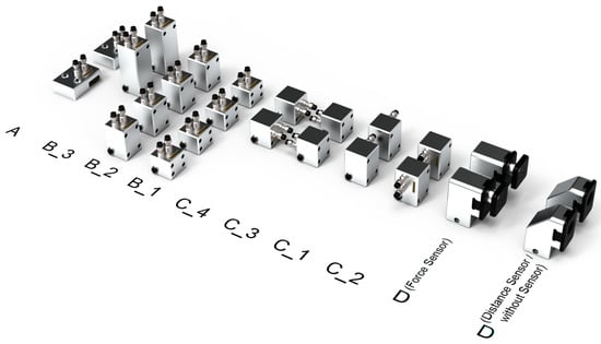 For the development of a configuration logic, the combinatorial scope of the problem, i.e., the diversity of all possible configurations, is relevant. Based on the previously described modular scope and the configuration problem, and considering the structural design of the gripper fingers, the combinatorial diversity can be derived. The structural setup of each finger always starts with the base module (A) and ends with a fingertip (D). The type of fingertip is determined by the user, depends on the grasping application, and is therefore not a free parameter of a configuration. Assuming that the gripping fingers are symmetrical, only one finger determines the variety of all possible module combinations. The modular scope is therefore halved. The base module and fingertip therefore do not contribute to increasing the number of variants. Building a configuration is like using modules from a construction kit with nine modules () without putting them back, considering the sequence (Formula (1)).