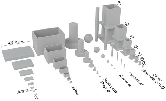 Hollow parts are therefore predestined for the use of force sensors in order to meet these requirements by actively controlling the gripping force. Compared to cylindrical parts, mushroom parts have similar gripping points, but they have a strongly modified interference contour and are thus suitable for validating the collision criteria in finger design. Flat parts are easy to grip due to their simple and planar outer contour. At the same time, variable finger lengths are possible. Flat parts are thus suitable for validating the requirement for short fingers. For the comparison with the automated finger design in [5], a test object is taken from this work. To represent variable dimensions, the basic shapes form the starting point of a series, which scales the workpiece dimensions over seven size levels. The size steps (numbers 1–7 in Figure 4) are created according to the geometric standard number series with the scaling factor 1.585 [34]. Figure 4 shows the workpiece spectrum.