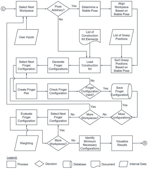 This paper presents the automated configuration of application-specific gripper fingers for two-finger parallel grippers from a modular construction kit, which includes, on the one hand, the automated determination of gripping points on objects and on the other hand the creation and evaluation of different gripper finger configurations (this includes the steps from B to C and C to D in Figure 2). Based on the handling objects and the gripper selected by the user, different gripping positions on different areas of the workpiece surface are determined and evaluated. Then, kinematic chains are determined from the modules of the construction kit and evaluated based on defined criteria (e.g., projection, number of modules). Thus, without expert knowledge and without multiple iterations, gripper finger configurations can be determined that are suitable for handling the respective handling object. The solution was implemented as a prototype and tested on a real system.