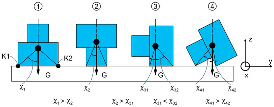 Figure 10 shows the definition of the tilt angle χ for a pose in terms of workpiece geometry and center of gravity. In the following, only contact situations are considered that circumscribe a planar contact situation (see Figure 10, pose 1–3). It should be noted here that gripping objects are usually provided in an active order and non-planar contact situations are avoided. To incorporate the preferred orientation into the kinematics of the gripping process, the coordinate system shown on the right is introduced, which corresponds to the directions of the gripper coordinate system.