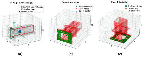 (a) Tilt angle evaluation of an object; (b) Starting orientation of an object; (c) Reoriented object.