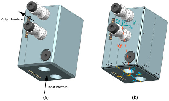 The design of a gripper finger consists of modules that are assembled in a defined sequence. However, the modular structure results in a high degree of shape variation. A set of rules is therefore necessary that determines the shape of the gripper finger on the basis of a module sequence. The kinematic chain of a finger takes place via the connection of the modules at the interfaces. The input interfaces of the modules represent the female part of the quick-change jaw system. The output interfaces are described via pins, which represent the male part of the quick-change jaw system (Figure 12a). In addition to the outer contour of the modules, the type, position, and orientation of the interfaces are also important for the finger shape. To describe the relationships, the module base coordinate system is introduced under the following conventions (Figure 12b):