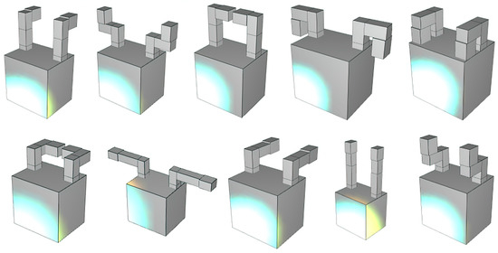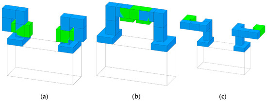 A collision of the fingers with the gripper base can also be described by the above Formula (9). In addition, it is true that finger modules must not be below the base plane of the gripper (i.e., ). When gripper fingers overlap, collisions between the modules of one finger (Figure 15a), between the two fingers (Figure 15b), and collisions due to the base jaw movement (Figure 15c) are possible. Both fingers collide as soon as they extend into the operating range of the other finger. If the yz-gripper center plane is exceeded, then the fingers come into contact due to the symmetrical boundary condition. Finger pairings that already touch each other in the fully extended state () cannot be mounted and must therefore be declared invalid. A pair of fingers blocks if the gripping space, which is spanned by the fingertips, is occupied by other modules.