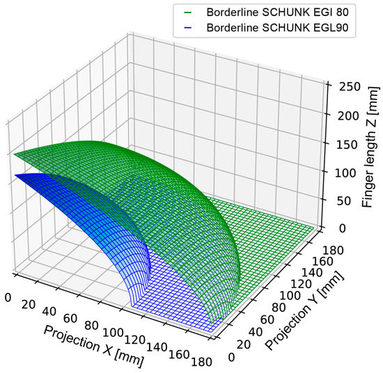 The position of the grasp point in the gripper coordinate system, in combination with the workpiece weight, determines the acting tilting moment on the base jaw. The criterion of the finger length already considers the tilting moment in the y-direction. A tilting moment about the z-axis occurs as a result of non-centered grips with projected fingers. This eccentricity is object-dependent if the virtual axis connecting the gripping points does not pass through the object’s center of gravity. The y-position of the fingertip is used to evaluate this criterion.