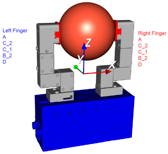 By modeling the individual modules, gripper fingers can be described by serially linking individual modules. A reference coordinate system is required for the comparison and evaluation of different configurations. The gripper coordinate system is introduced according to the conventions of established gripper manufacturers (see Figure 13).