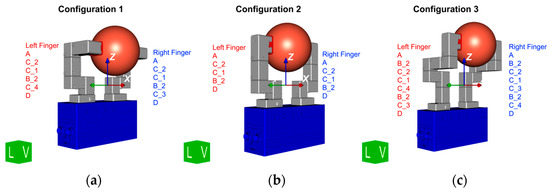 An excerpt of the configuration results for the sphere shown earlier is shown in Figure 18. Three configurations are listed here as an example. The corresponding evaluation can be taken from Table 1. In configuration 1 in Figure 18a, each finger consists of six modules and has projections in the gripping direction and perpendicular. Configuration 2 in Figure 18b consists of five modules each and with a projection only in the gripping direction to achieve the necessary opening width. In configuration 3 (Figure 18c), each finger consists of eight modules. In addition, there are projections in the gripping direction and perpendicular. As the number of modules increases, the torque on the base jaws of the gripper increases and the gripping force decreases. With increasing projection, the load on the base jaw increases and thus also does the wear of the gripper. This is reflected in the evaluation in Table 1: Configurations 1 and 3 achieve a lower overall utility than configuration 2 due to the larger projection and the larger number of modules.