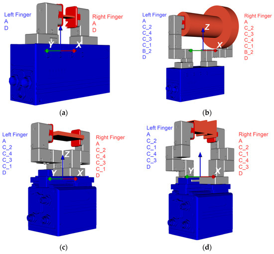 Finger configuration for (a) Flat part 1 (Gripper SCHUNK EGI 80); (b) Mushroom part 5 (Gripper SCHUNK EGI 80); (c) Flat part 3 (Gripper SCHUNK EGL 90); (d) Schmalz part 2 (Gripper SCHUNK EGL 90).