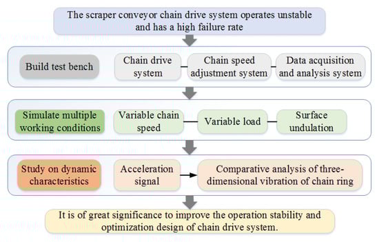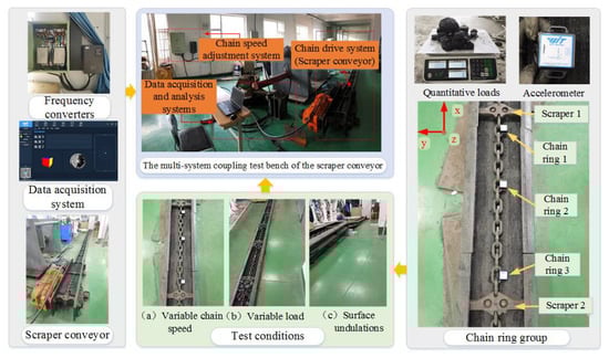 In this paper, a chain drive system test bench was first built, and then the dynamic characteristics of the chain ring between two adjacent scrapers were tested under various working conditions, including variable chain speed conditions, variable load conditions, and surface undulation conditions. Based on the collected acceleration signals, we draw the following conclusions: