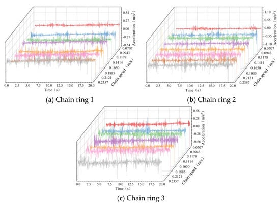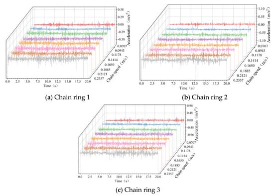 In the literature [], the dynamic characteristics of the entire chain drive system under different chain speeds were studied using the vibration signal of the output shaft of the reducer, but the dynamic characteristics of specific local components (such as chain ring, sprocket, and other parts) were not explored in the study. Therefore, this paper conducted a comparative and analytical study of the three-dimensional dynamic characteristics of chain rings at different positions.