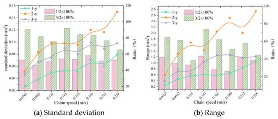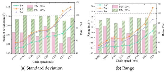 Figure 3 illustrates the statistical analysis of the acceleration change trend of the chain ring in the running direction. It can be found that as the chain speed increased, the acceleration fluctuation range of the three rings showed a gradual upward trend. The acceleration intervals corresponding to the maximum and minimum chain velocities (0.0707 m/s, 0.2357 m/s) in this test were statistically calculated and shown in Table 5. It can be observed that the amplitude of the chain ring at 0.2357 m/s was greater than the amplitude at 0.707 m/s. Exactly, the significant tension in the running direction resulted in relatively stable vibration of the chain ring in this direction. Statistics were made for the standard deviation and range of the curve in Figure 3, as shown in Figure 4. Simultaneously, the relationship between the chains was studied by using the acceleration data of chain ring 2 as the denominator and the data of the chain rings 1 and 3 as the numerators.