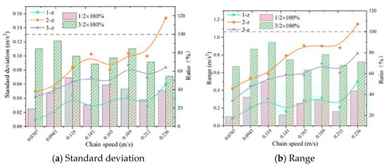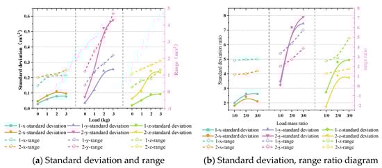 Indeed, as observed in the above figures, the vibration amplitude of both chain ring 1 and chain ring 2 increased with the increase in load in all three directions. To quantitatively study the vibration of chain rings 1 and 2, the standard deviation and range of the curves in the above figure were calculated and are presented in Figure 13a. Simultaneously, the standard deviation and range of the chain ring under different load masses (1 kg, 2 kg, 3 kg) were compared with the standard deviation and range of the no-load (0 kg). The ratio is shown in Table 6 and drawn in Figure 13b.