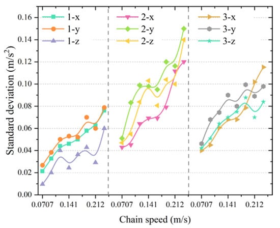 In this section, a comparison is made regarding the vibration of the chain rings in three directions. The vibration of the chain ring was analyzed using the standard deviation of the acceleration of the chain ring, as illustrated in Figure 9.