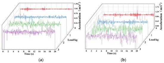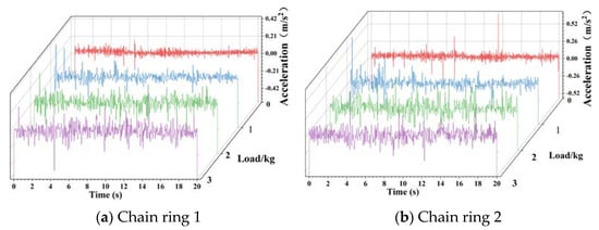 In this section, the dynamic characteristics of the chain ring are studied under variable load conditions, specifically at 0 kg, 1 kg, 2 kg, and 3 kg loads. As the chain ring 3 was pressed by the coal transported on the middle groove, its acceleration could not be directly measured in the test. Consequently, only the three-way acceleration of chain ring 1 and 2 was measured.