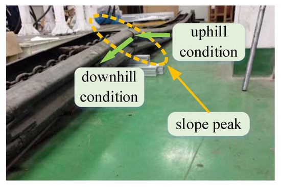 In the mine, the coal mining face was often uneven due to factors such as the movement of hydraulic supports and, so, it was necessary to study this working condition []. Figure 14 illustrates the schematic diagram of the surface undulation condition. The chain ring underwent the following sequence: straight condition—uphill condition—slope peak—downhill condition—straight condition in turn. In the surface undulation condition, the terrain formed a convex shape. The height of the middle groove at the uphill and downhill was symmetrical about the highest point of the convexity.