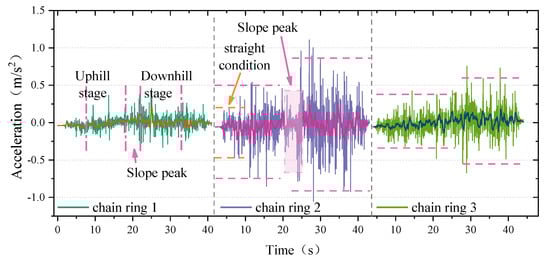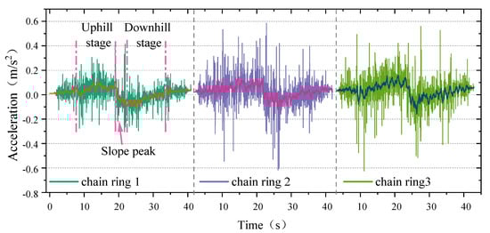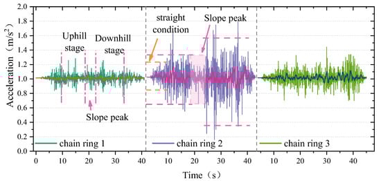 In the uphill stage, the chain ring acceleration gradually increased in the positive direction. The maximum amplitude of chain ring 2 was 0.545 m/s2; and the maximum amplitude of chain ring 3 was 0.42 m/s2, which was 77.06% of chain ring 2. Meanwhile, the maximum amplitude of chain 1 was 0.305 m/s2, which was 55.96% of chain ring 2. During the first 10 s in the straight condition, a more intense vibration was generated compared to the subsequent movement of the chain ring.
