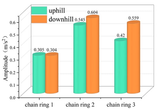 Moreover, the chain amplitude of the uphill and downhill was calculated and presented in Table 7, as well as plotted in Figure 16. It is evident from the chart that the vibration of the downhill was more intense than that of the uphill. In other words, the chain ring exhibited significant fluctuations when moving downhill. The reason for this was that the tension between the chain ring and the chain ring was smaller during downhill movement compared to uphill, leading to intensified vibration.