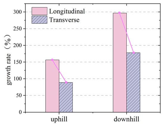 Figure 19 presents the statistical analysis of the vibration growth rate of uphill and downhill in both longitudinal and transverse directions. The figure shows that whether it was uphill or downhill, the longitudinal vibration growth rate was consistently higher than the lateral vibration growth rate. Therefore, this working condition had a greater impact on the longitudinal direction of chain ring 2.