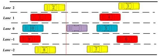 Vehicle Relations with Surrounding Vehicles. (purple represents the current vehicle, blue represents the same lane vehicle, red represents adjacent lane vehicles, and yellow represents adjacent second lane vehicles. The vehicle to the left of the red dotted line is after the longitudinal position of the main car. For the convenience of illustration, the vehicle is marked and its designation is shown in the figure.)