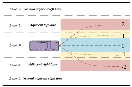 When a vehicle travels on a multilane expressway, the driver can change lanes to the left or right. Therefore, the adjacent lanes need to be defined considering the safety state of the lanes to the left and right of the self-propelled vehicle and the driving state of the surrounding vehicles. A diagram of the driving behavior of adjacent lanes and vehicles is shown in Figure 3.
