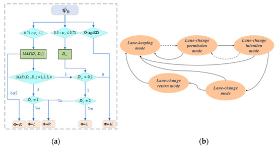 The upper two subsections devise a lane-change willingness based on fuzzy theory and classify the safety levels of the adjacent lanes of the self-driving car, solving the problem of determining when to change lanes, whether it is safe to do so around the self-driving car, and whether there are conditions for changing lanes. These two parts are combined to form a complete driving logic, as shown in Figure 4a. Based on this driving logic, a decision based on a finite state machine is designed, as shown in Figure 4b. In the figure, the values K, L, and R of φ indicate lane keeping, lane changing to the left, and lane changing to the right, respectively. The specific flow of the decision is as follows: when the willingness to change lane ψh is derived, a judgement in made to determine whether the vehicle needs to change lanes. A DL/DR value of 4 means that the left and right adjacent lanes are safe for lane changing, whereas a DL/DR value of 3 means that a lane change is required based on the driver’s style. No lane change is required if the driver style parameter Ddr value is 0. If the value of Ddr is 1, the next step is to determine if the associated vehicle has not changed lanes, then there is room for the self-driving vehicle to change lanes. Otherwise, no lane change is allowed. The fuzzy control table can set the driver style in the fuzzy lane-change intention controller. To ensure the safety of the self-driving vehicle throughout the lane change process, the vehicle’s safety posture monitoring of the target lane is permanently active.