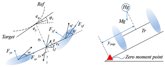 A predetermined zero-moment point predicts the risk of wheel lift if the front wheel angle is inappropriate. Therefore, the zero-moment point can be used as an anti-rollover constraint for the model predictive controller to reduce the risk of rollover by normalizing the zero-moment point to the front wheel steering angle. The normalization of the lateral offset yZMP of the zero-moment point concerning the wheelbase is shown in Equation (32):