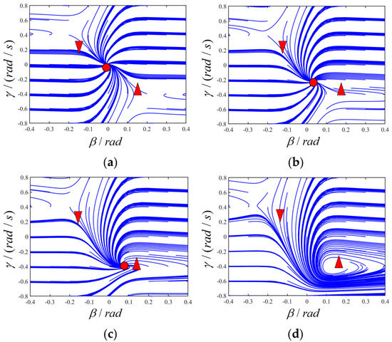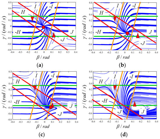 Figure 8 shows stability boundary under different front wheel angles, which are 0 rad, 0.12 rad, 0.20 rad and 0.31 rad, respectively, at 98 km/h. It can be observed from Figure 8a,b that the position of the vehicle equilibrium point and the stability boundary are related to the corresponding maximum/minimum side deflection angles of the front/rear wheels. As the front wheel turning angle increases, the equilibrium point gradually converges from (0, 0) to the saddle point position, whereas J and −J change accordingly, forming the stability boundary. When the front wheel turning angle reaches −0.20 rad, lines H and J intersect near the saddle point in Figure 8c, indicating that the vehicle is in a critical state. If the steering angle continues to increase, the saddle point will disappear and the J and −J envelopes defined by the front wheels and H and −H, I, and −I will not be able to form a closed envelope area, which means the vehicle will tend to be unstable, as shown in Figure 8d.