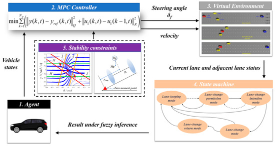 Finite state machines are the most commonly used decision-making method; they implement intelligent vehicle driving decisions by designing state logic, coupling methods, and conditions. Balal et al. [11] proposed a fuzzy inference system that could be utilized to make behavioral decisions under expressway conditions. Model predictive control was used to handle multilane decision making in defined scenarios. Yang et al. [12] proposed a multilane cooperative control strategy that uses a cooperative model to solve the optimal merging order of vehicles in different lanes and achieves safe merging through longitudinal optimal control. The proposed method was able to improve driving efficiency and reduce fuel consumption. However, the method is more applicable to longitudinal control. Lin et al. [13] proposed a coordinated formation planning method to solve the congestion problem by forming formations in areas of temporary traffic congestion through alert notification and protocols. However, their approach only used heuristics and did not explore optimal control. Angelo Coppola et al. [14] investigated the problem of forward tracking control for heterogeneous and uncertain nonlinear autonomous vehicles. The proposed algorithm considered the time-varying parameter uncertainty of the nonlinear vehicle dynamics and the reduction of air resistance due to formation travelling. Furthermore, an adaptive control strategy for coordinating active front steering and direct yaw torque was proposed to improve the path tracking accuracy under high velocity and extensive curvature conditions. Ren et al. [15] designed a model predictive controller based on the overall control structure of active front steering and motor torque distribution for the in-wheel electric vehicle transverse sway stability control problem. They completed the validation on an eight-degrees-of-freedom electric vehicle model.