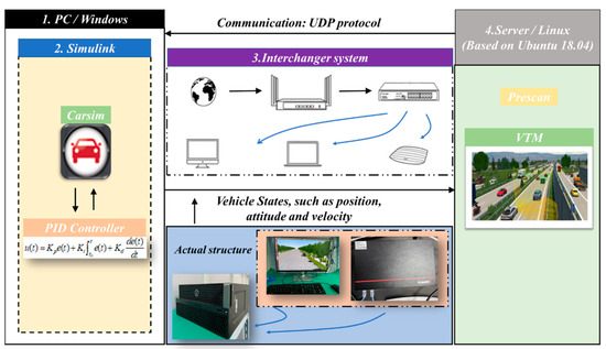 In this section, the joint simulation of intelligent vehicles under high-speed multilane conditions is carried out using PreScan2019.1, Carsim 8.5, matlab 2020a.to build a common simulation platform to verify the vehicle’s decision layer, planning layer, and controller. Road scenarios, including other traffic participants and road models, were built in PreScan and the corresponding algorithms were designed in Matlab/Simulink. The co-simulation framework has been given as Figure 10.