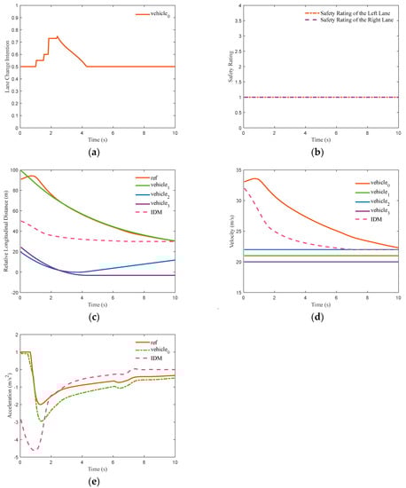 Simulation results for following the driving conditions. The subfigures (a–e) donate the change of intention, safety rating, relative longitudinal distance, velocity and acceleration, respectively.