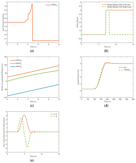 Simulation results for the constant speed lane change conditions. Simulation results for constant speed lane change conditions have been given as Figure 14. The subfigures (a–e) donate the change of intention, safety rating, relative longitudinal distance, lateral position and yaw angel and yaw rate, respectively.