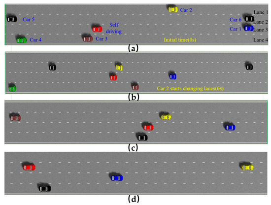 Simultaneous lane change condition. The subfigure (a) donates the initial status of the simulation results. The subfigures (b,c) donate the intermediate process of the simulation results. The subfigure (d) donates the end status of the simulation results.
