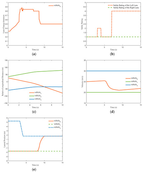 Simulation results for simultaneous lane change conditions. Simulation results for simultaneous lane change conditions have been given as Figure 16. The subfigures (a–e) donate the change of intention, safety rating, relative longitudinal distance, velocity and lateral position, respectively.