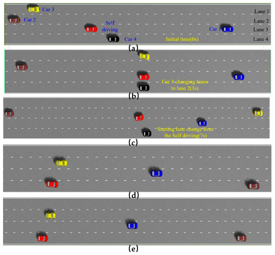 Slow lane change conditions. The subfigure (a) donates the initial status of the simulation results. The subfigures (b–d) donate the intermediate process of the simulation results. The subfigure (e) donates the end status of the simulation results.