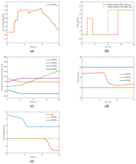 Simulation results of slow lane change conditions. Simulation results for slow lane change conditions have been given as Figure 18. The subfigures (a–e) donate the change of intention, safety rating, relative longitudinal distance, velocity and lateral position, respectively.