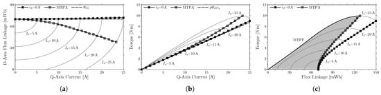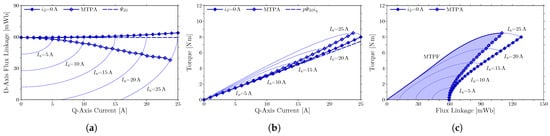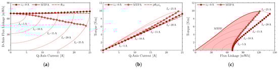 Figure 2b shows the torque for the q-axis current in the zero d-axis current operation in CONV. Each thin line denotes the torque for current phase at each armature current . In addition, the torque production without magnetic saturation, which is estimated using the number of pole pairs p, the no-load d-axis flux linkage as